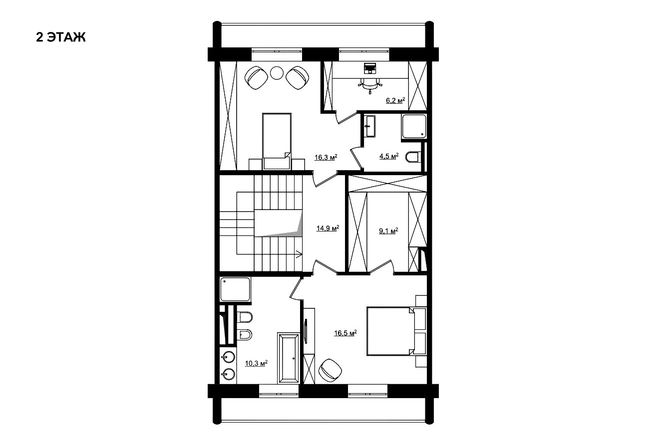 На 2-м уровне – спальни, ванные комнаты и гардеробные для подрастающего поколения.