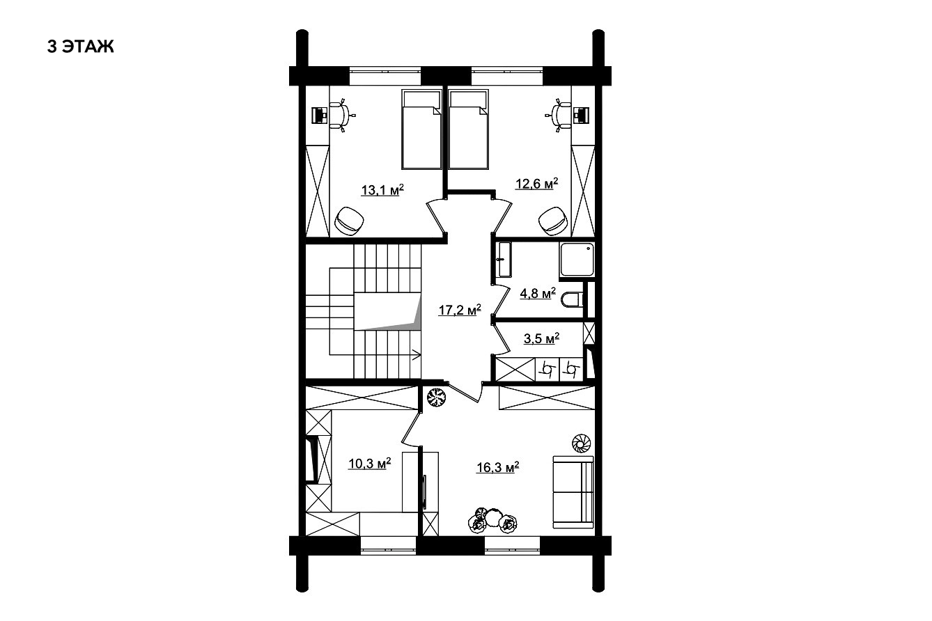 На 3-м уровне расположена зона хозяев с спальнями, кабинетом, ванной комнатой и гардеробными.